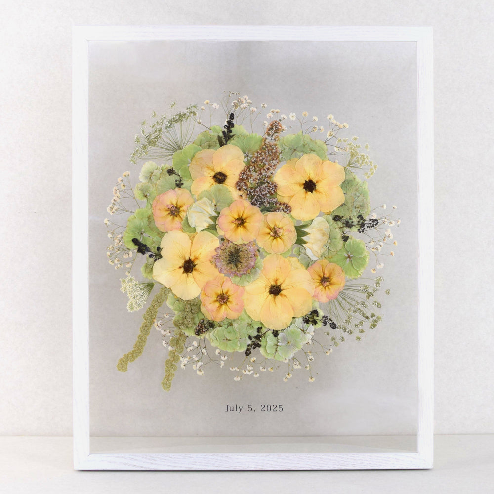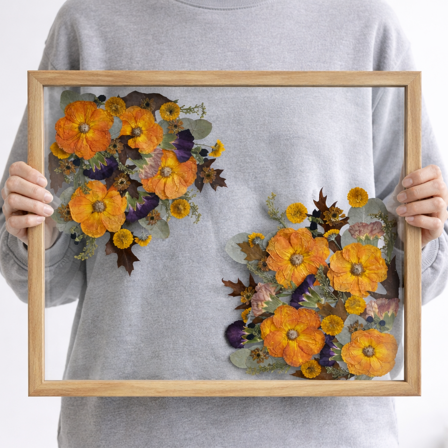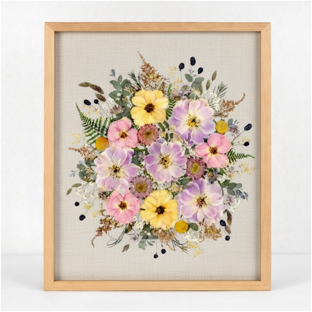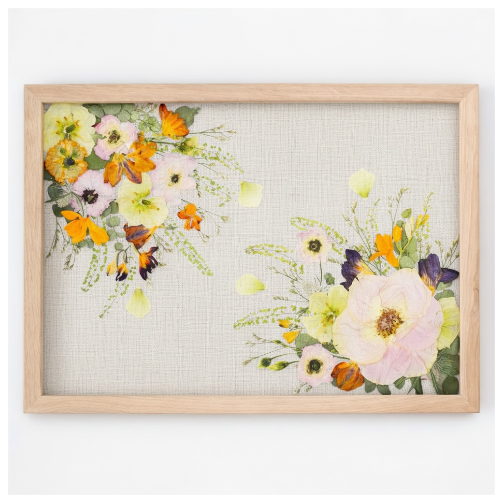 Nach dem Trocknungsprozess arrangieren wir die Blüten neu und gestalten daraus ein zeitloses Erinnerungsstück, das eure Hochzeit dauerhaft bewahrt.