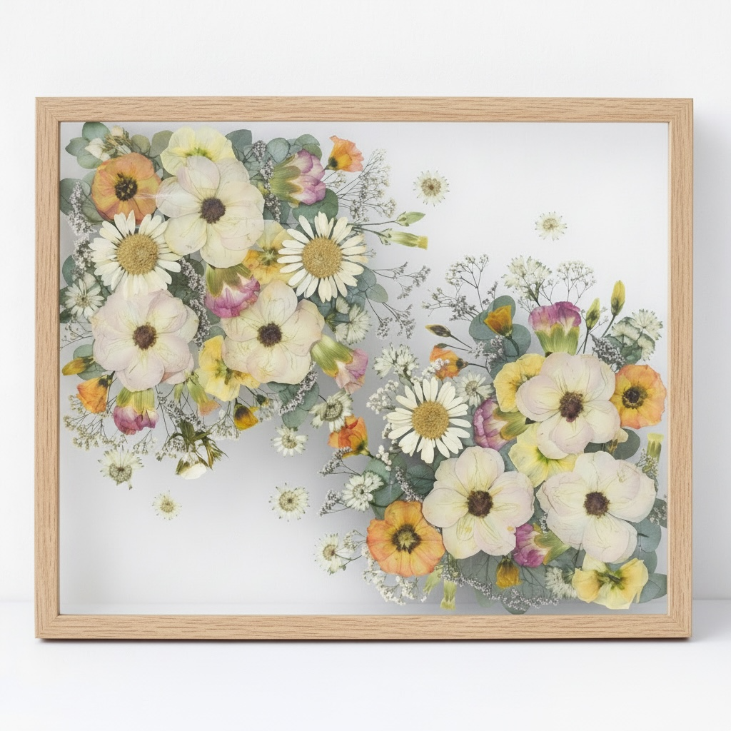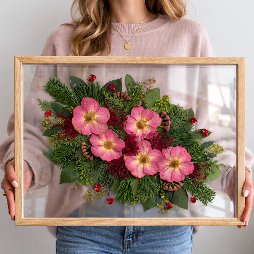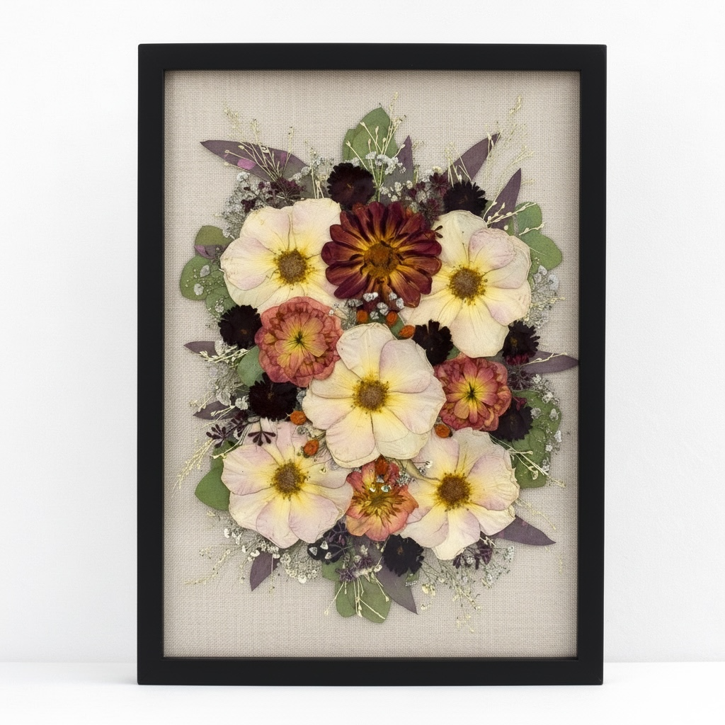 Nach dem Trocknungsprozess arrangieren wir die Blüten neu und gestalten daraus ein zeitloses Erinnerungsstück, das eure Hochzeit dauerhaft bewahrt.