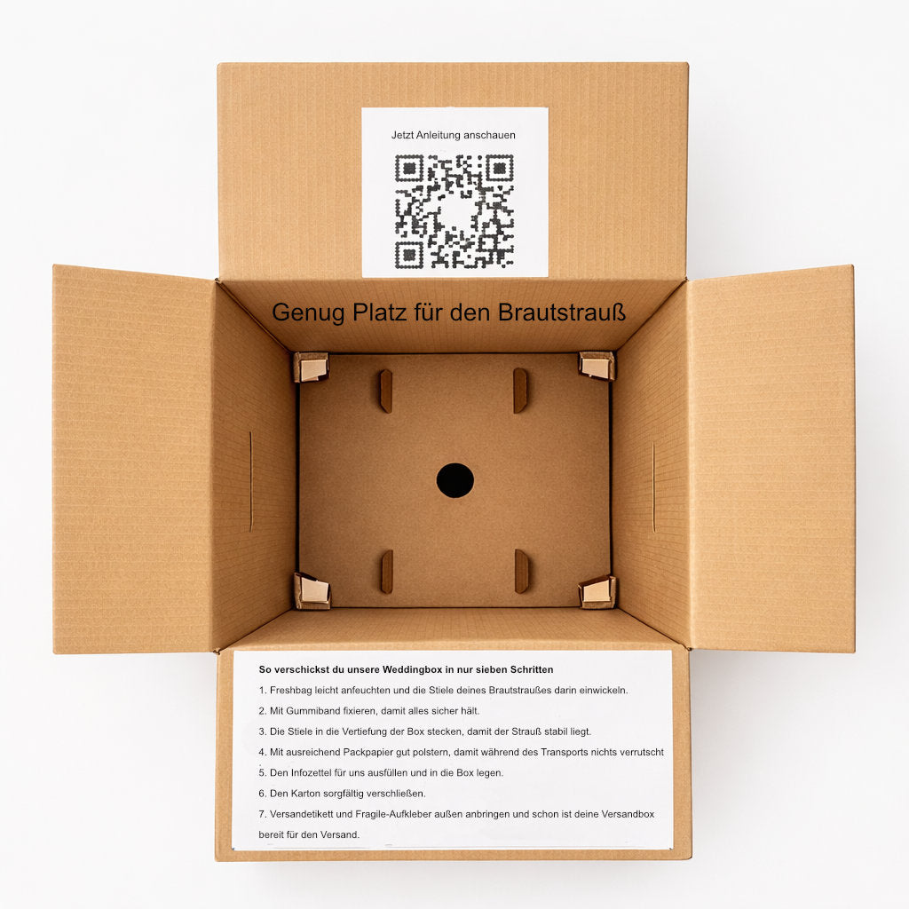 Am einfachsten geht das mit unserer Wedding Versand Box. Darin findet ihr alles, was ihr braucht: eine Schritt-für-Schritt-Anleitung, das passende Verpackungsmaterial und ein Express-Versandlabel. So könnt ihr euren Brautstrauß sicher verschicken und müsst euch keine Sorgen machen.