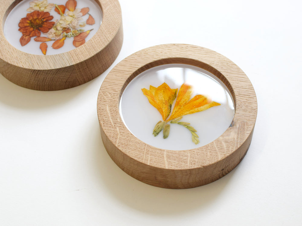 Ringschale aus Eichenholz mit Epoxidharz und Blüten