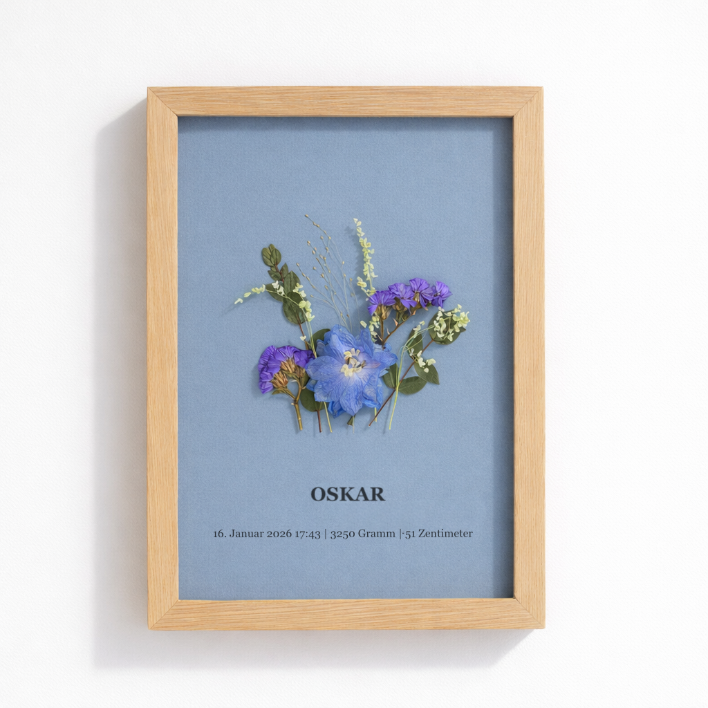 Mit echten konservierten Blumen bringst du Natürlichkeit in Kinder- und Wohnzimmer und als personalisierter Rahmen wird daraus ein einzigartiges Geburtsgeschenk.