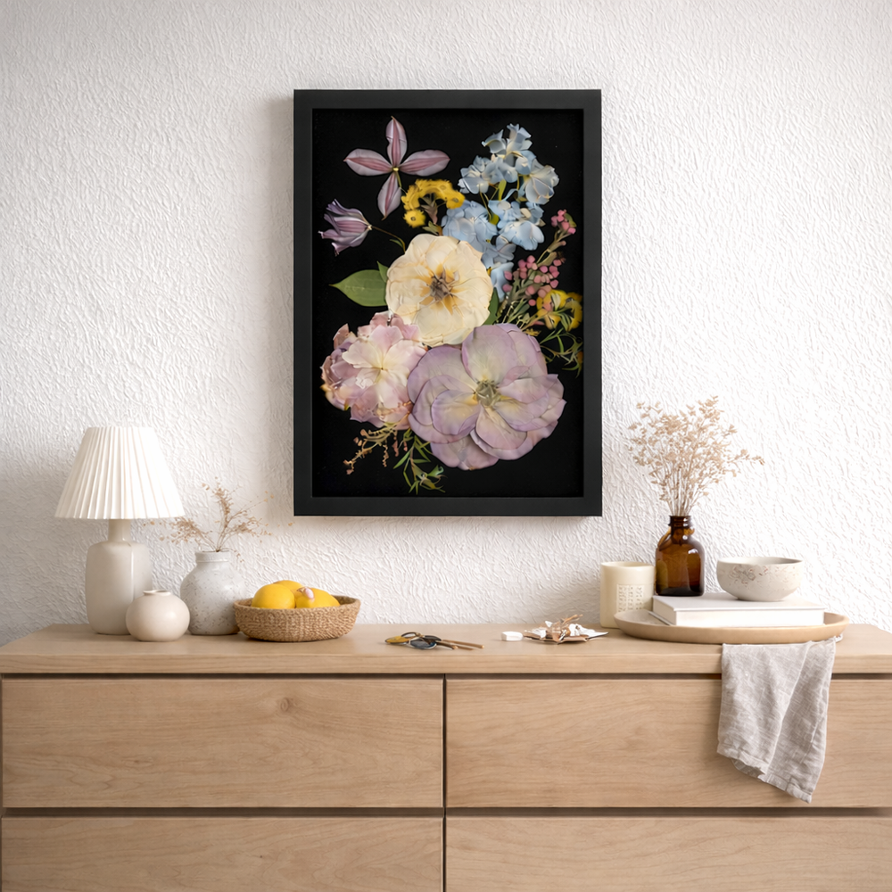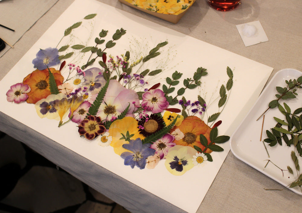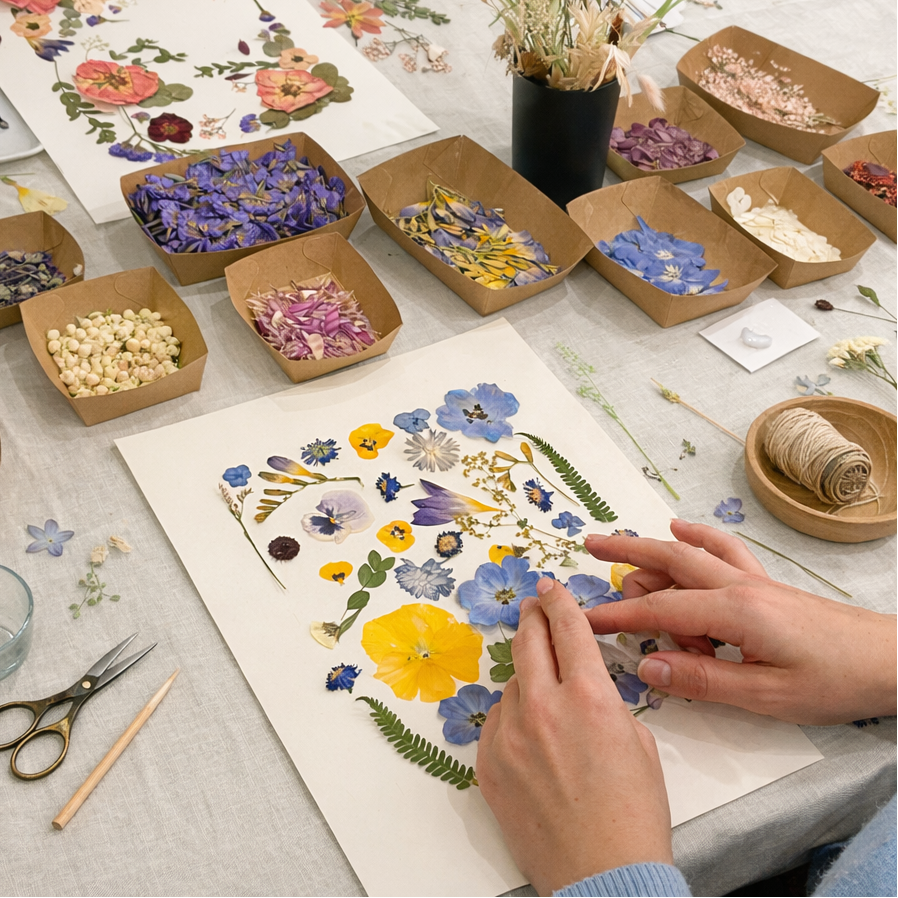 In unseren Workshops gestaltest du dein eigenes Blumenbild und verwandelst echte Blüten in ein ganz persönliches Kunstwerk.